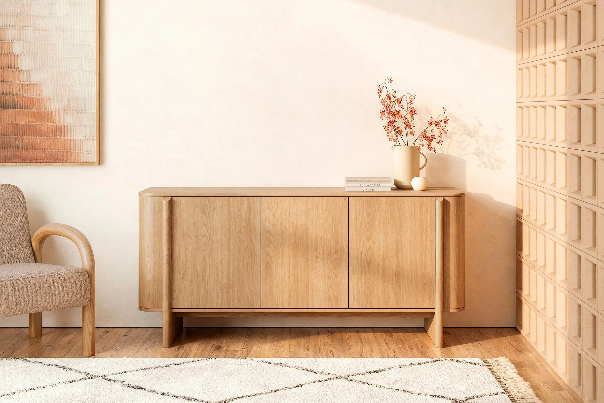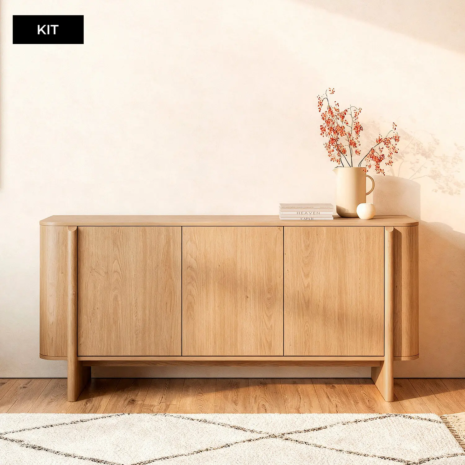 Presentado en formato mueble KIT , el aparador de 3 puertas de la colección SIDNEY combina practicidad y diseño contemporáneo. Está fabricado en melamina, un material que aporta calidez y pone en valor la veta natural de la madera, creando una sensación acogedora y elegante en cualquier estancia. Su diseño de líneas rectas y depuradas se refuerza con el sistema de apertura push , que prescinde de tiradores visibles y mantiene una estética limpia y minimalista. Con 160 cm de ancho, ofrece una amplia capacidad de almacenaje, siendo una solución funcional y estilosa para salones o comedores de estilo moderno, nórdico o contemporáneo.