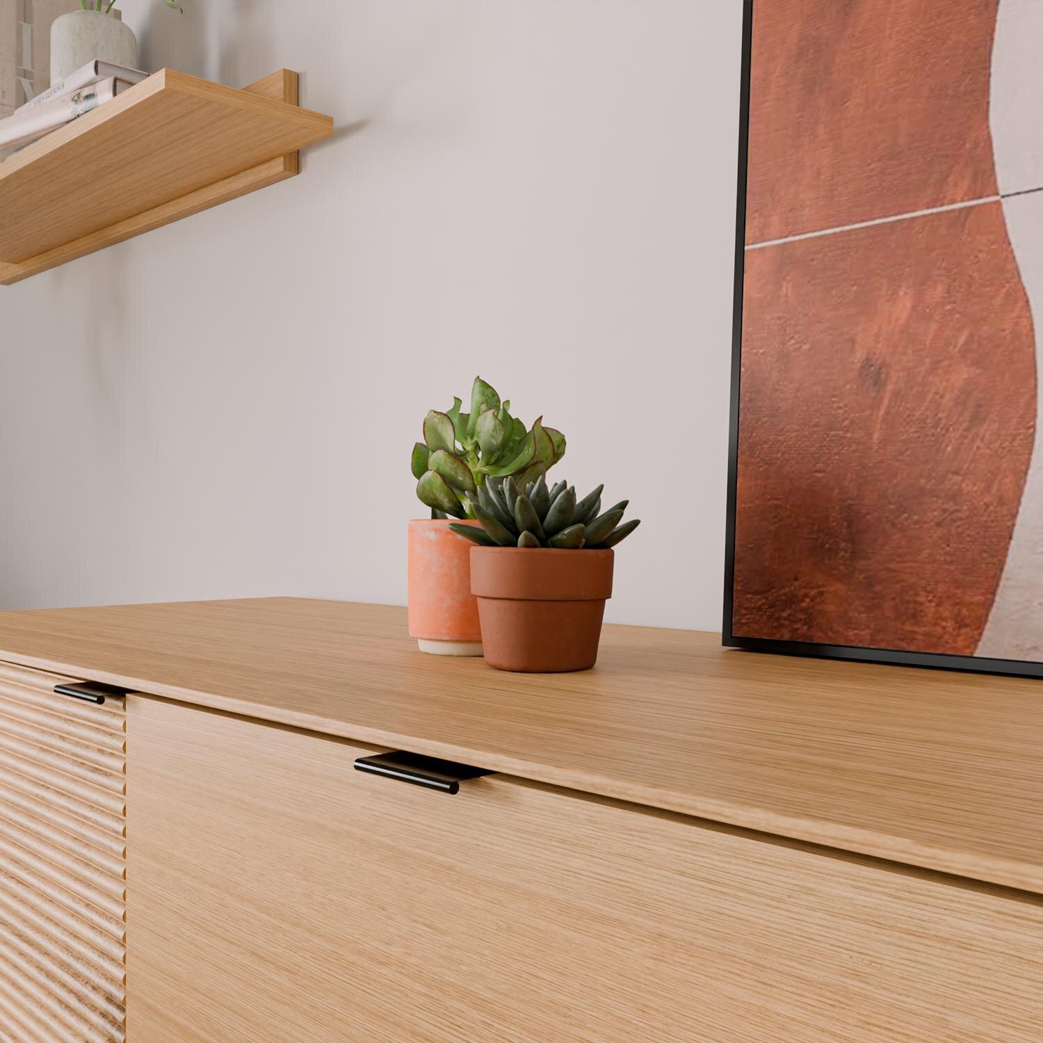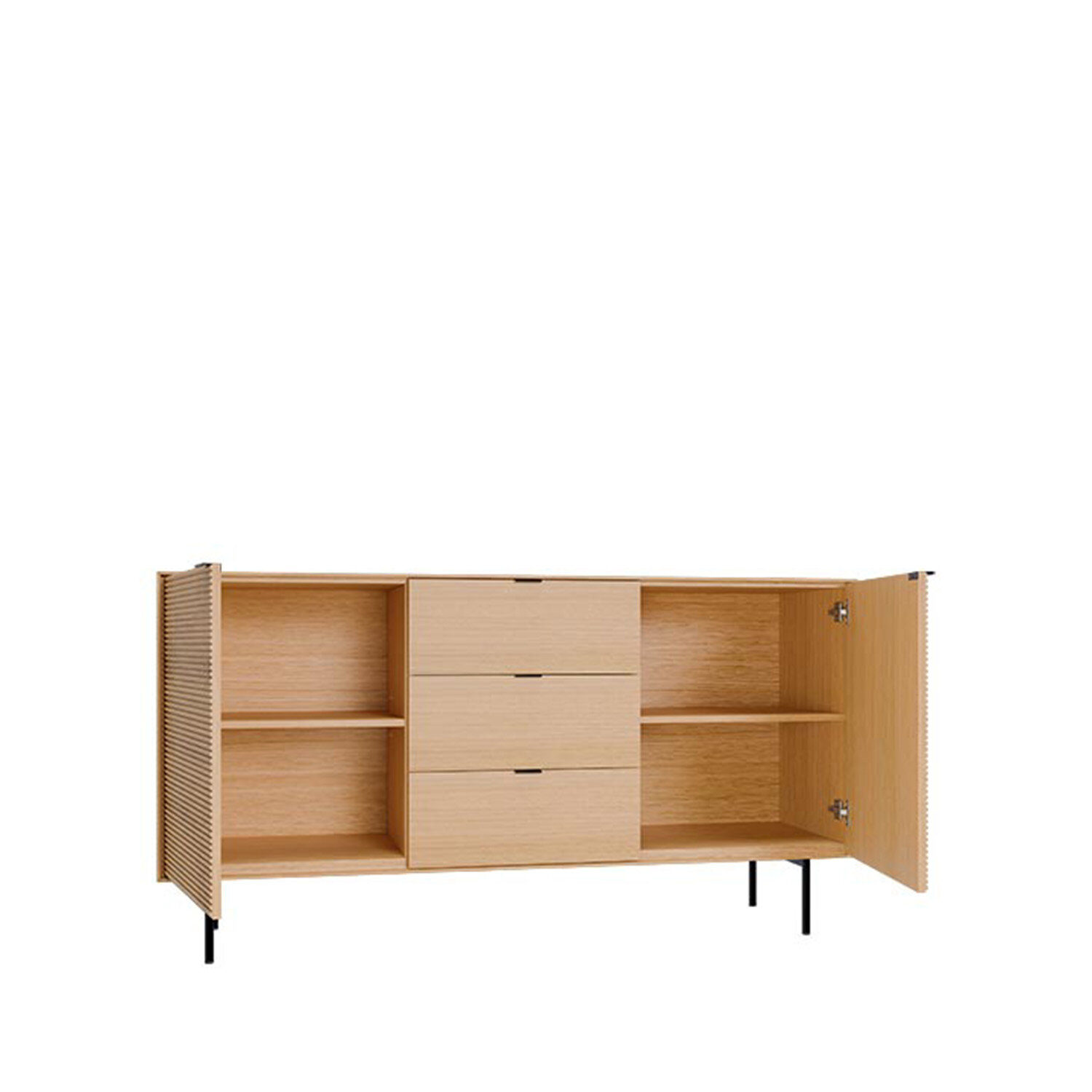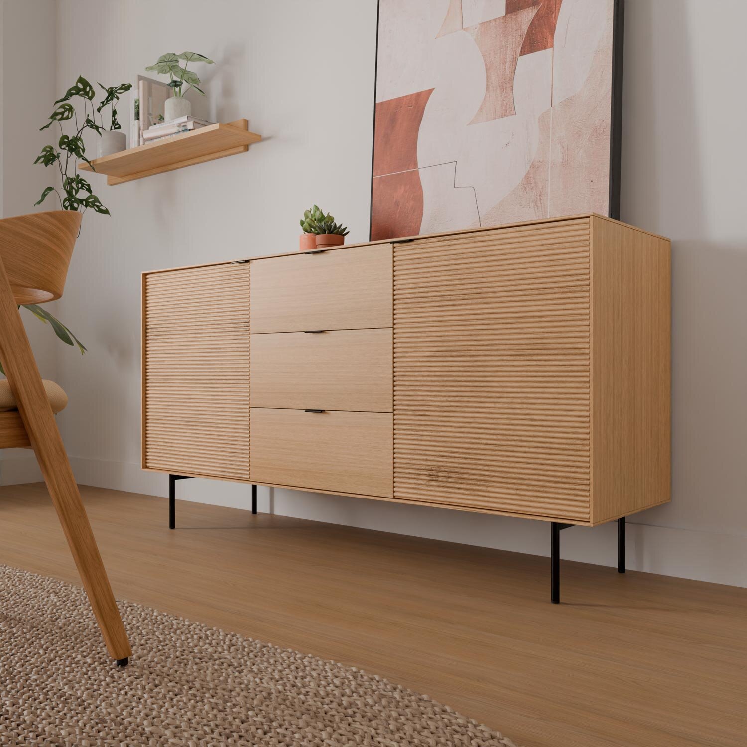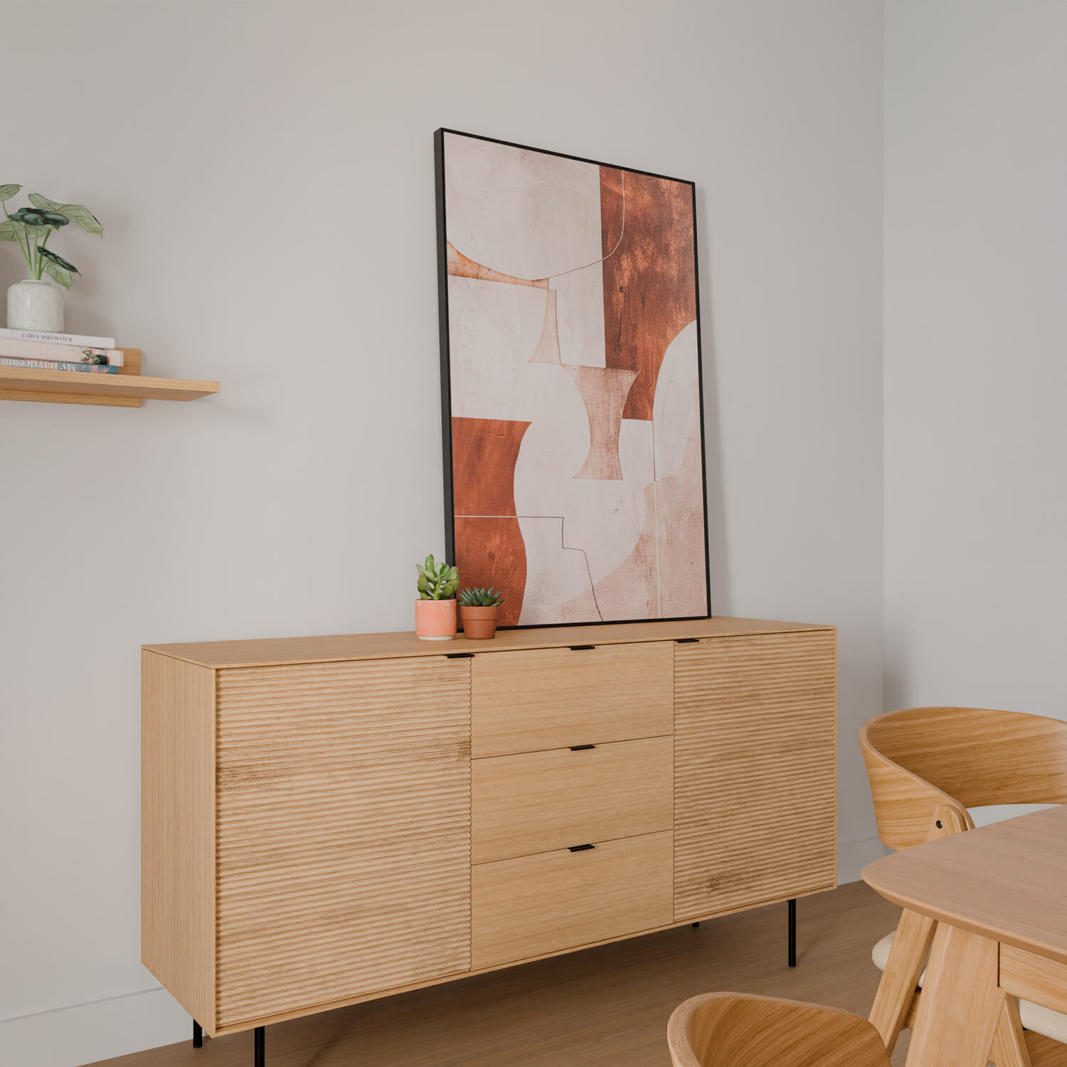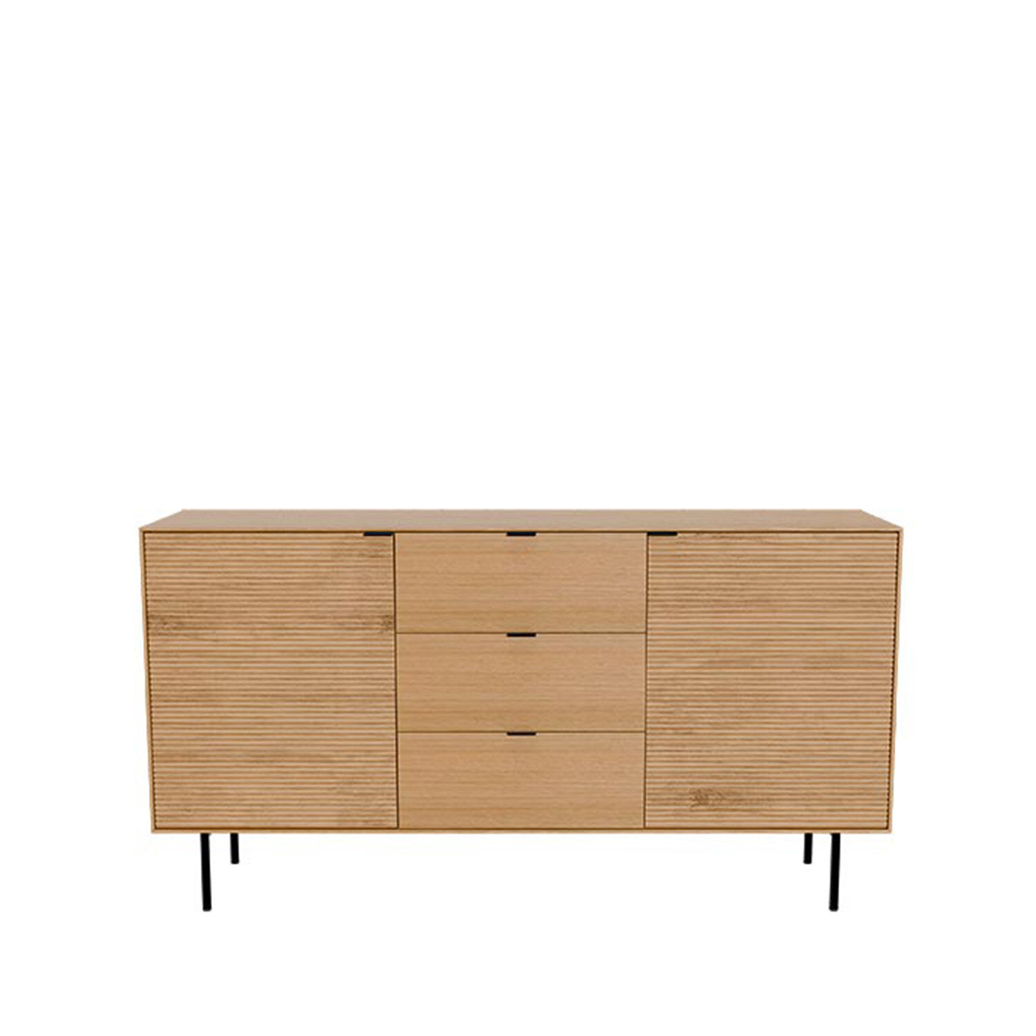 El aparador TULSA de 160 cm encarna la elegancia atemporal con un diseño robusto y materiales nobles. Su estructura en chapa de roble natural se combina con frentes de puertas y cajones en madera maciza de roble rayado, aportando textura y un carácter distintivo que realza la calidez del mueble. Con dos puertas y tres cajones, ofrece una solución de almacenaje amplia y bien distribuida, ideal para salones, comedores o espacios de trabajo. El sistema de apertura soft closing y las guías metálicas ocultas garantizan una experiencia de uso suave y silenciosa. Las patas metálicas negras y los tiradores a juego aportan un contraste moderno que equilibra perfectamente su estética natural. El aparador TULSA es una pieza funcional con presencia, pensada para ambientes que combinan estilo contemporáneo y esencia orgánica.