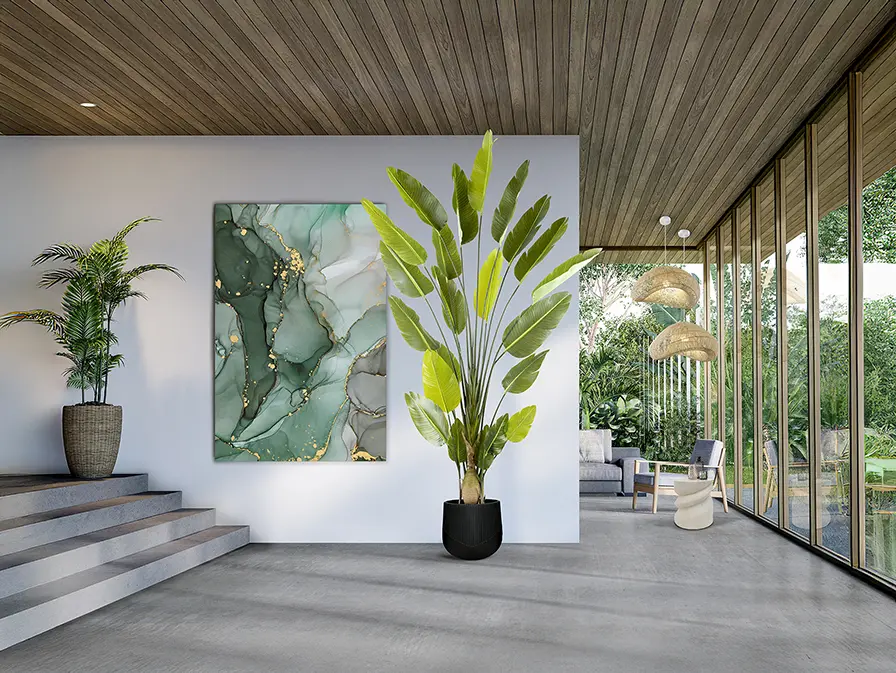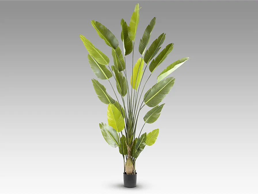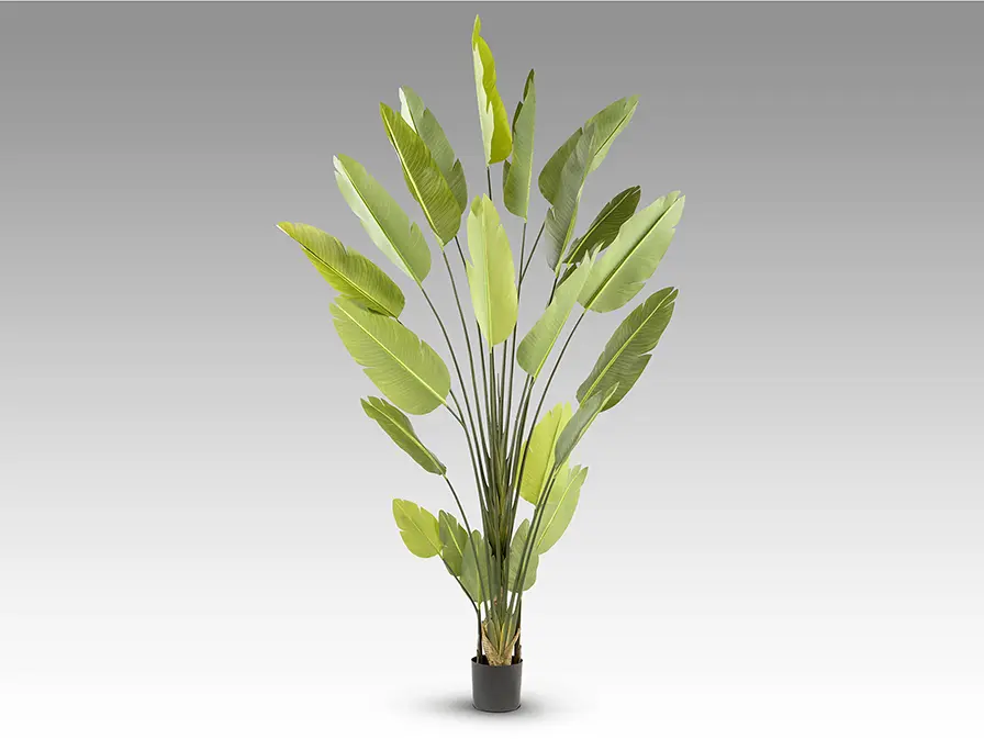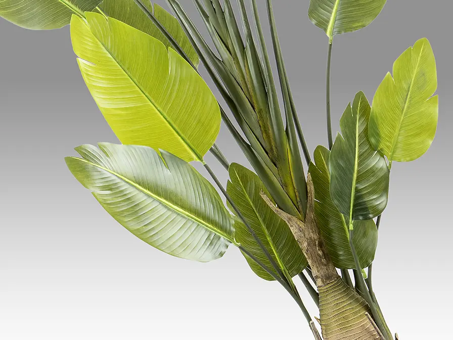 STRELITZIA REGINATA o AVE DEL PARAISO, planta artificial realizada en PVC y metal. Incluye base de cemento con musgo artificial y maceta (Ø19 x 18 cm).