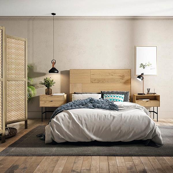 El cabezal TULSA de 180 cm aporta personalidad y calidez al dormitorio gracias a su diseño en madera maciza de roble con detalle rayado. La estructura en chapa de roble refuerza su estética natural, ideal para ambientes serenos y contemporáneos.