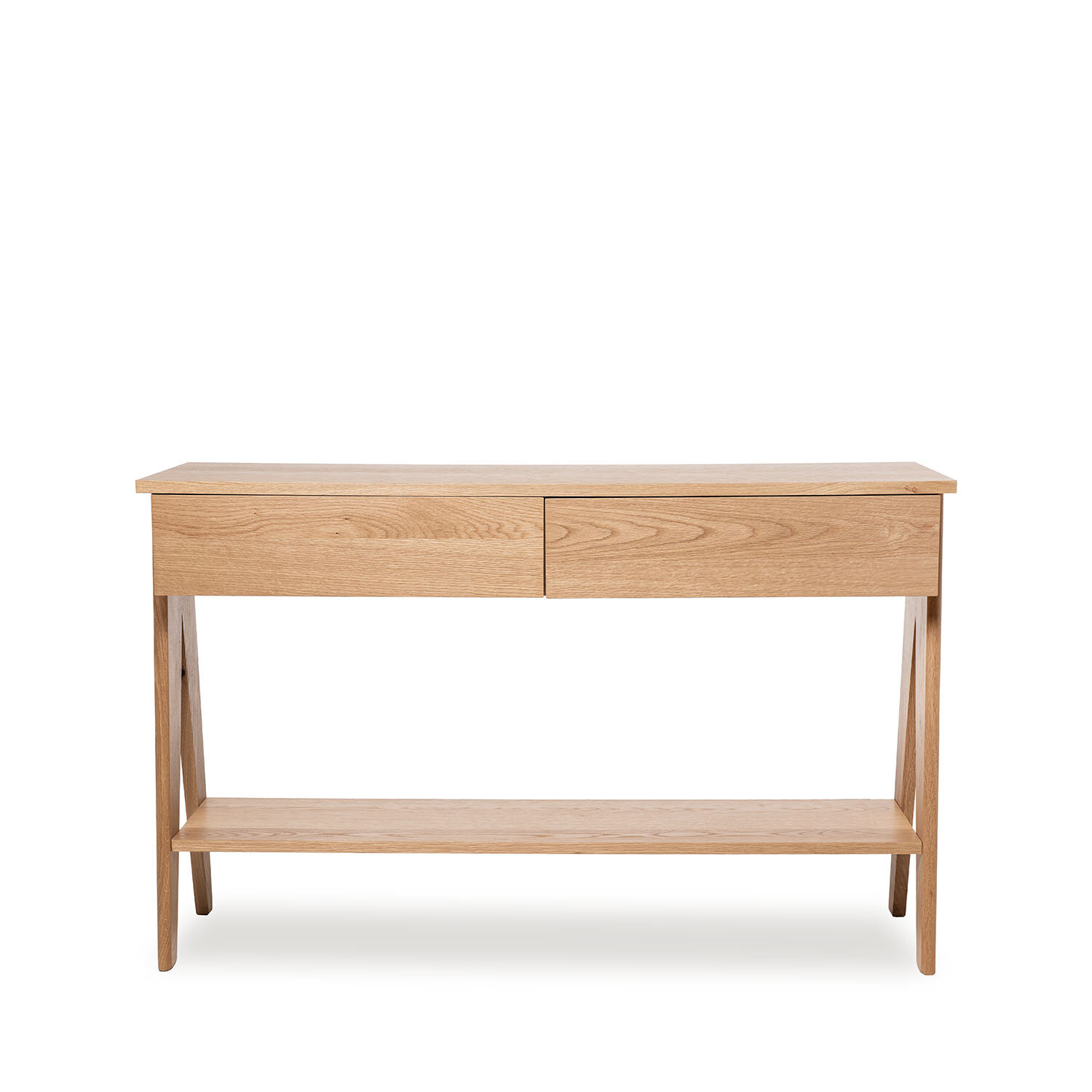 Consola de madera de roble perfecta para la entrada de casa o para cualquier otra estancia gracias a su diseño limpio y moderno. La consola ELVAS está formada por dos estructuras: una con dos cajones amplios y otra con un estante abierto que abarca todo el largo de la consola, ofreciendo espacio adicional para almacenamiento o exhibición. Su acabado en roble le da un toque natural y cálido, convirtiéndola en una pieza atractiva, elegante y funcional.