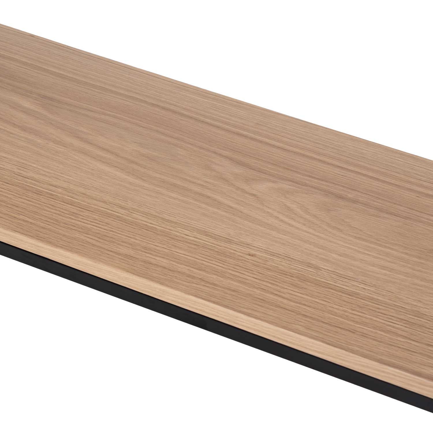 Consola fabricada en madera de roble y metal. Este mueble es perfecto para colocar en la entrada de la casa o en cualquier otra estancia que busque un artículo funcional y de diseño, como el salón o el dormitorio. La consola RIGA destaca por su diseño llamativo, con soportes laterales metálicos en forma de cruz que contrastan el color negro con la calidez natural del estante de roble.