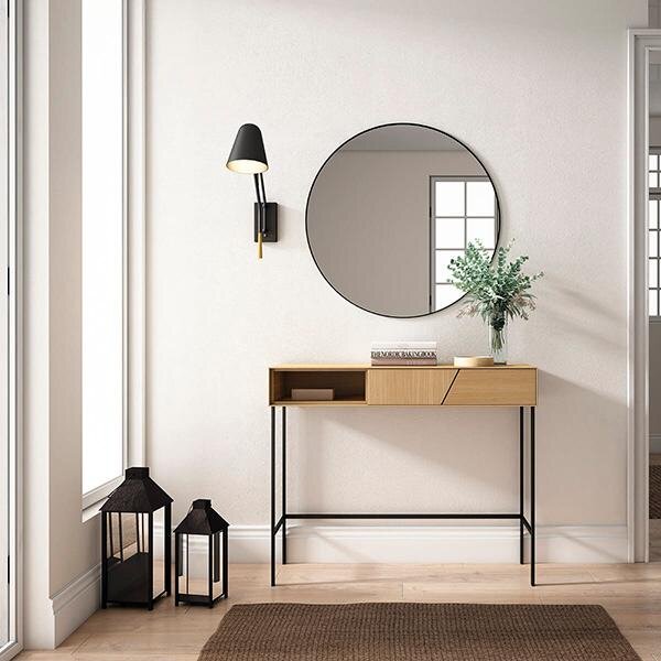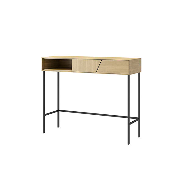 La consola SIENA roble aporta calidez natural con un diseño funcional y sofisticado. Fabricada en chapa de roble natural, incluye un cajón con apertura PUSH y hueco lateral de almacenaje, ofreciendo practicidad sin renunciar al estilo. El frente del cajón, también en roble, se realza con una raya fresada lacada en negro, que aporta textura y un contraste sutil. Las guías metálicas ocultas garantizan un deslizamiento suave y discreto. Completan el conjunto sus patas metálicas negras, que refuerzan su estética contemporánea. Ideal para recibidores modernos que buscan orden, calidez y diseño con personalidad.