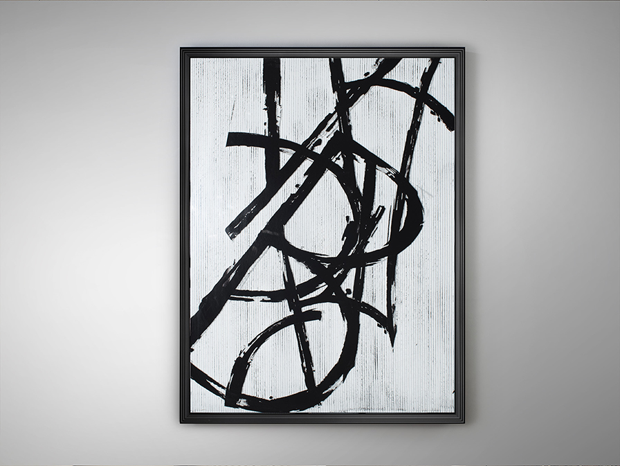 Composición gráfica. Cristal impreso, sobre papel texturizado y base de DM. Marco de poliestireno negro.
