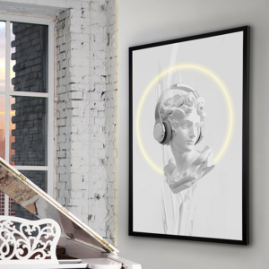 Mujer abstracta con violonchelo, composición con tira de luz led decorativa. Lienzo impreso, pegado sobre tabla y enmarcado en negro.