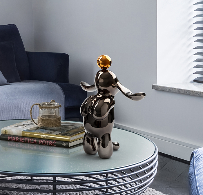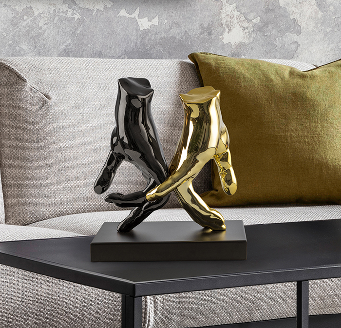 Figura realizada en fibra de vidrio y resina de poliester, acabado baño de oro brillo, tulipa esférica de acrílico acabado opal mate.
