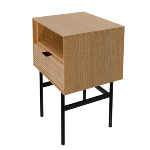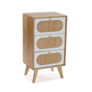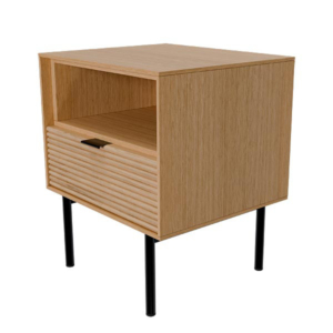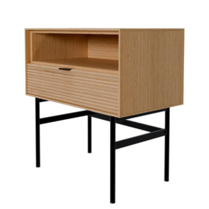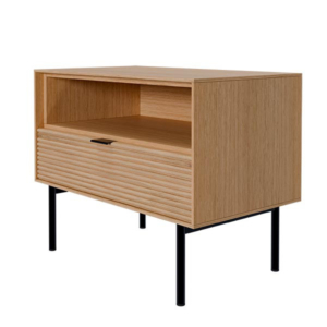 La cómoda TULSA con tres cajones combina funcionalidad y diseño natural en una pieza de líneas limpias. Su amplia capacidad de almacenaje la convierte en una opción ideal para dormitorios que buscan orden con estilo. Con estructura en chapa de roble y frentes en madera maciza rayada, destaca por su calidez visual. Los detalles metálicos en negro y el sistema soft closing aportan un toque contemporáneo y una experiencia de uso confortable.