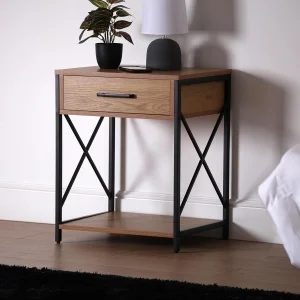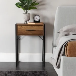 Mesilla de noche con patas. 2 cajones con guias metálicas. 1 cajón con frente en rattan decorativo. Papel laminado. Patas en madera. Medidas: 40 x 39 x 48 cm.