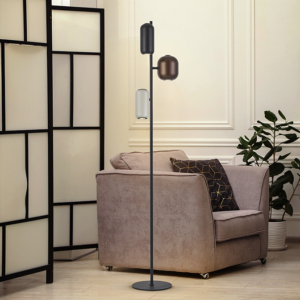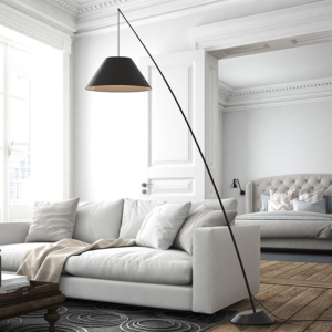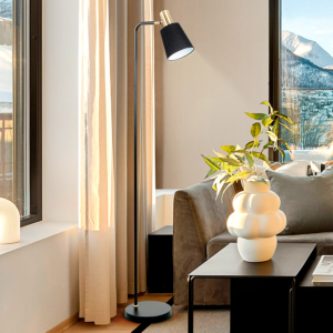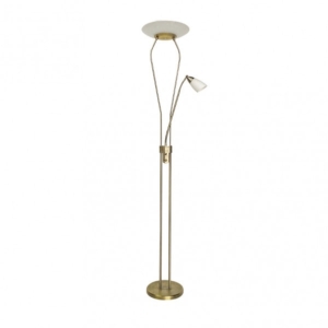 Lámpara de pie en metal y aluminio, color blanco mate, difusor opal. Pulsador táctil y CONTROL REMOTO. 2 luces regulables en altura y orientables, funciones simultaneas e independientes: luz dimable, temperatura de color regulable. 20W LED, 1800 lm,