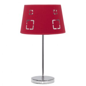 Sobremesa serie Celaya de color rojo. Realizado en metal color cromo y material textil. La pantalla presenta un diseño con formas geométricas caladas que dejan pasar la luz. Sus dimensiones son 43x25x25 cm. Está disponible el colgante y pie de salón en color rojo y varios colores. El portalámparas es E14.