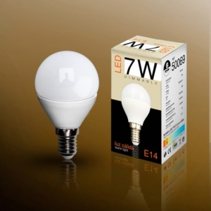 Bombilla mini globo opal LED DIMABLE de 7W. Luz cálida 3.000K. 560 lúmenes, equivalente a incandescente de 60W. Haz de luz de 180°. Para portalámparas E27.