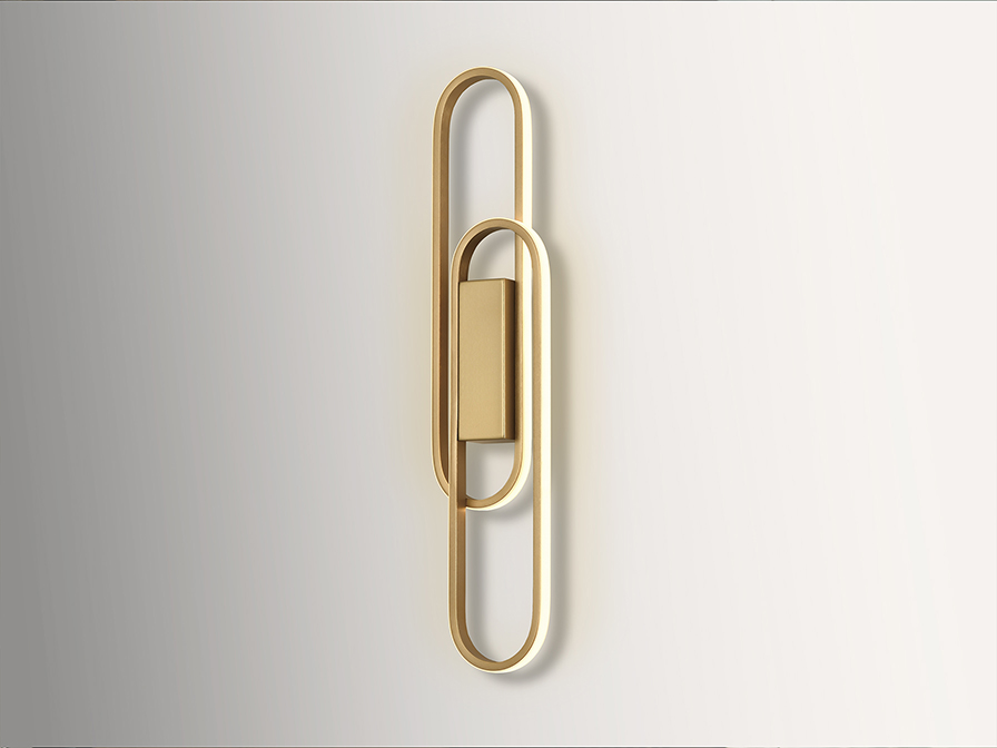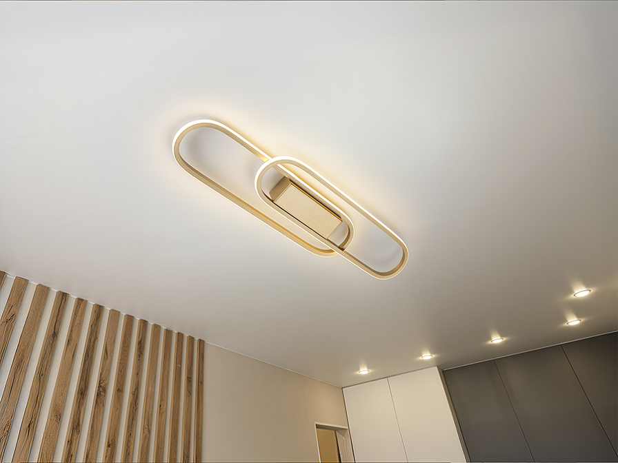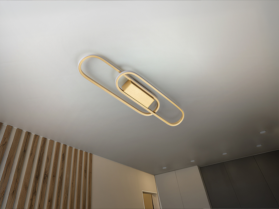 Lámpara de pared o plafón de techo, realizado en aluminio y metal, acabado dorado mate. 2 óvalos con luz LED y difusor de silicona opal. 24W LED. 2.100 lm. 3.000 K.