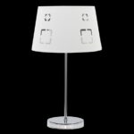 Sobremesa serie Celaya de color blanco. Realizado en metal color cromo y material textil. La pantalla presenta un diseño con formas geométricas caladas que dejan pasar la luz. Sus dimensiones son 43x25x25 cm. Está disponible el colgante y pie de salón en color blanco y varios colores. El portalámparas es E14.