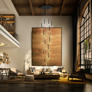 Lámpara realizada en metal y aluminio, acabado negro mate. Aro con difusor de acrílico opal. Altura regulable. 55W LED. 3.000K. 3.300 lm