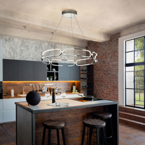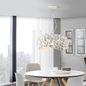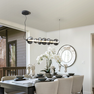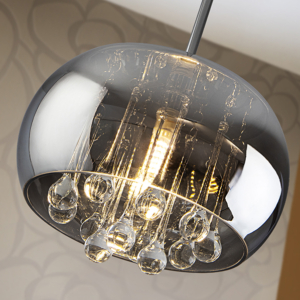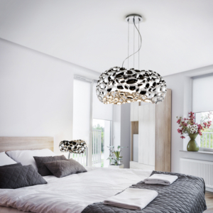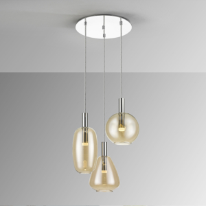 Lámpara de 12 luces LED, realizada en metal acabado cromo. Tulipas poliédricas realizadas en cristal macizo con burbujas decorativas en su interior. Regulable en altura. 48W LED. 5400 lm. 3.000 K.