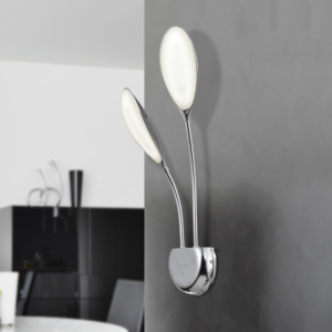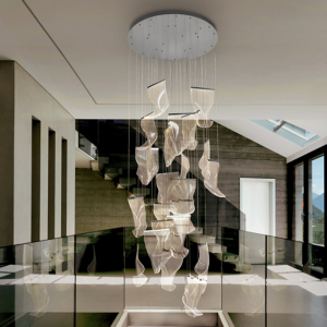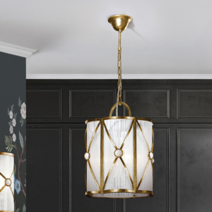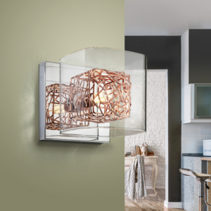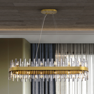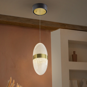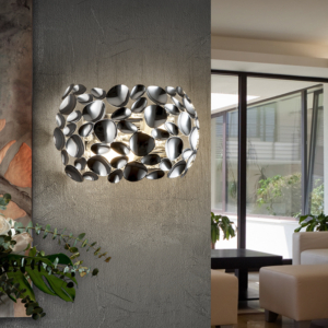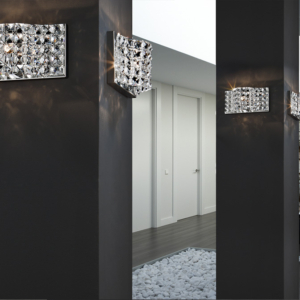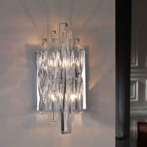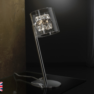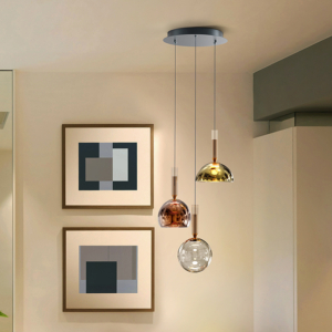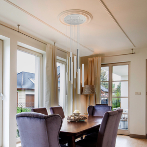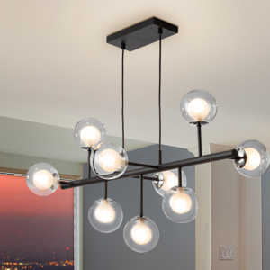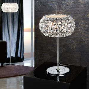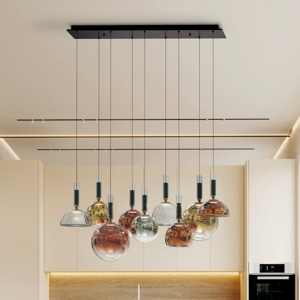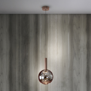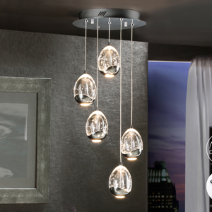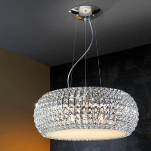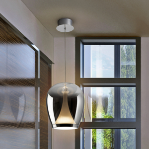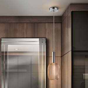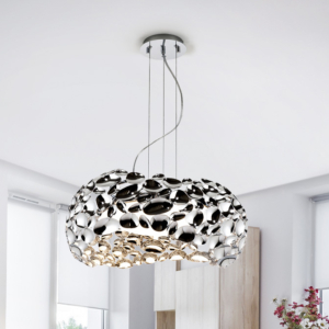 Lámpara esferoidal realizada en metal cromado. Varillas radiales de cristal transparente con las puntas decoradas en baño cromo oscuro. Altura regulable.