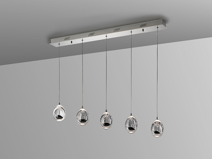 Lámpara de 5 luces LED, realizada en metal acabado cromo. Tulipas con forma de gota realizadas en cristal macizo con burbujas decorativas en su interior. Regulables en altura. 25W LED. 2.400 lm. 3.000 K. DIMABLE.