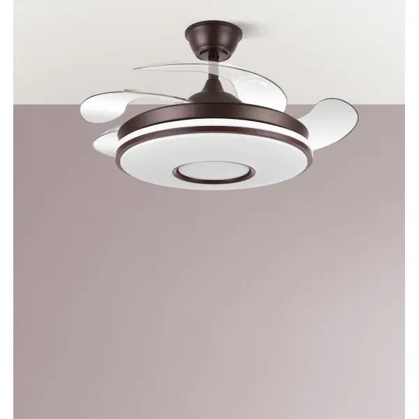 Ventilador DC serie DANI realizado en metal, policarbonato, en color MARRON con cuatro aspas DESPLEGABLES de ABS transparente muy resistentes. Tiene seis velocidades ajustables. Motor DC. Tecnología LED integrada con una potencia de 59W, con 3 TEMPERATURAS SELECCIONABLES DE LUZ (3000-4200-6500K) luz cálida, natural y blanco frío, y 6980 lúmenes. Control de aire verano o invierno. Su medida es de 34/41,5X50 centímetros con las aspas plegadas y de 34/41,5X106 centímetros con las aspas desplegadas. Incluye dos tijas de 12,5 y 20 centímetros, para instalar a distintas alturas. Mando a distancia INCLUIDO, REGULABLE EN INTENSIDAD, con MEMORIA DE COLOR incorporada y TEMPORIZADOR 2/4 H. Modelo disponible en color cuero, blanco, negro, marrón y níquel, además de en dos tamaños diferentes.