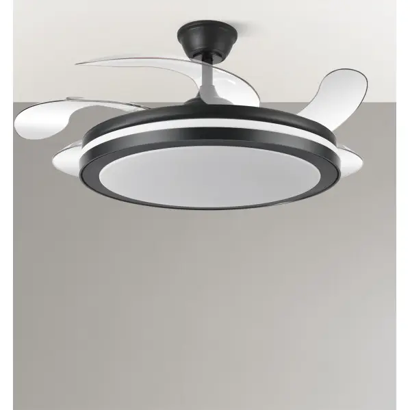 Detalles: Color: Negro. Peso Neto: 8250. Peso Bruto: 10320. Medidas embalaje: 67X67X20. Dimensiones (alto x ancho x fondo): 36,5/49X58/132. Material: Metal / ABS / Policarbonato. Potencia: 80 W. Lúmenes: 10255. Temperatura luz: 3000-4000-6000. Voltaje: 186 – 265 V. Clasificación energética: E. Color de la luz: Blanco Cálido, Frío y Natural. Uso (Interior/Exterior): Recomendado para interiores. Tipo de iluminación: Tecnología LED integrada. Proyección de la luz: Luz difusa general. Tipo de instalación: En superficie. Mando a distancia incluido: Mando a distancia incluido. Ahorro de energía: Ahorro de energía. Uso (Doméstico/Profesional): Doméstico. Número de aspas: 5. Número de velocidades ajustables: 6. Control de aire para verano o invierno: Verano e Invierno. Medida del diámetro (cm.): 132. _Velocidad_1_Consumo: 10. _Velocidad_2_Consumo: 15. _Velocidad_3_Consumo: 22. _Velocidad_4_Consumo: 29. _Velocidad_5_Consumo: 34. _Velocidad_6_Consumo: 40. _Velocidad_1_RPM: 135. _Velocidad_2_RPM: 150. _Velocidad_3_RPM: 165. _Velocidad_4_RPM: 180. _Velocidad_5_RPM: 195. _Velocidad_6_RPM: 210. _Velocidad_1_Flujo Aire: 4974. _Velocidad_2_Flujo Aire: 6960. _Velocidad_3_Flujo Aire: 8190. _Velocidad_4_Flujo Aire: 9980. _Velocidad_5_Flujo Aire: 11910. _Velocidad_6_Flujo Aire: 12890. _Velocidad_1_Nivel Sonido: 20. _Velocidad_2_Nivel Sonido: 25. _Velocidad_3_Nivel Sonido: 30. _Velocidad_4_Nivel Sonido: 35. _Velocidad_5_Nivel Sonido: 40. _Velocidad_6_Nivel Sonido: 45. Tipo de motor: Motor DC. Color de luz regulable: Color de luz seleccionable en 3 posiciones. Memoria: Memoria de color incorporada. Certificado CE: true. Certificado Reciclaje: true. Temporizador ventilador: 1H < 4H. CRI: >85. Material Motor: Metal / Policarbonato. Material Aspas: ABS. Color Motor: Negro. Color Aspas: Transparente. Incluye Tija de dos medidas: 10cm y 25cm. Apto para techo inclinado: No. Tamaño del diámetro: Grande: De 132 cm. a 179 cm.. Tamaño: XL. Diámetro cerrado: 58. Diámetro abierto: 132. Tres temperaturas de Luz: Tres temperaturas de Luz