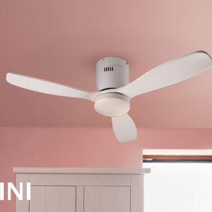 Ventilador de techo, luz LED DIMABLE y CCT (temperatura de luz regulable), realizado en metal acabado blanco mate, difusor acrílico opal y aspas escamoteables transparentes. Motor DC, 6 velocidades e inversión. Temporizador, función brisa y memoria.