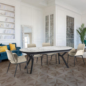 Mesa de centro ovalada, estructura realizada en MDF acabado negro mate. Tapa de MDF con superficie melaminica de alta resistencia, acabado piedra mate, con cantos en negro mate.