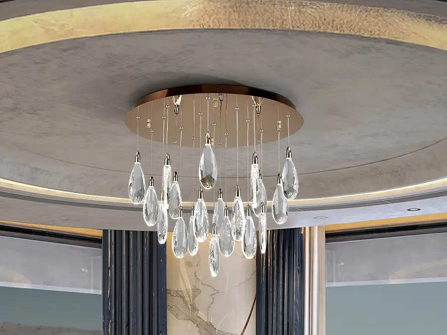 Lámpara realizada en acero y metal, acabado oro rosa. 19 luces con lágrimas de cristal tallado con bordes craquelados. Regulable en altura. Iluminación LED 38W, CCT: 2700-6000 K,3.800 lm, DIMABLE. Incluye mando a distancia.