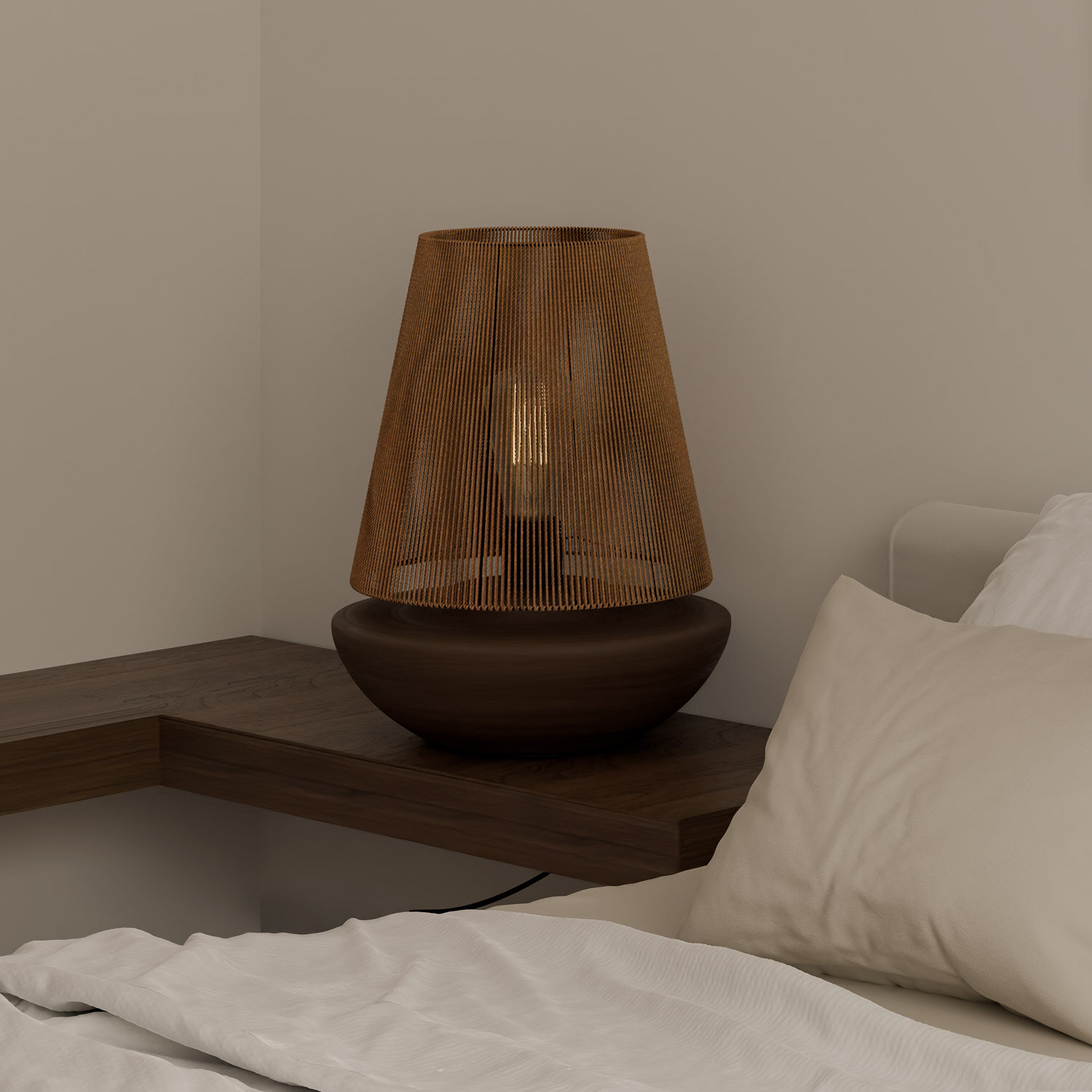 La lámpara de sobremesa BEIRES es una pieza que aúna funcionalidad y elegancia, diseñada para aportar calidez y estilo a cualquier estancia. Su base de cerámica en tono café no solo proporciona una estructura robusta y estable, sino que también añade un toque de refinamiento a la decoración. La pantalla de cuerda de cáñamo, por su parte, permite una difusión de luz suave y envolvente, generando un ambiente acogedor y relajante. Gracias a su diseño atemporal, la lámpara BEIRES se adapta con facilidad a distintos estilos decorativos, desde espacios modernos y minimalistas hasta entornos más clásicos o rústicos. Su tamaño compacto la convierte en una opción ideal para colocar sobre mesitas auxiliares, escritorios o cómodas, funcionando tanto como luz de ambiente en el salón o el dormitorio como iluminación puntual en cualquier rincón del hogar. Tipo bombilla: 220/240 E27. Potencia máxima: 40W (bombilla no suministrada).