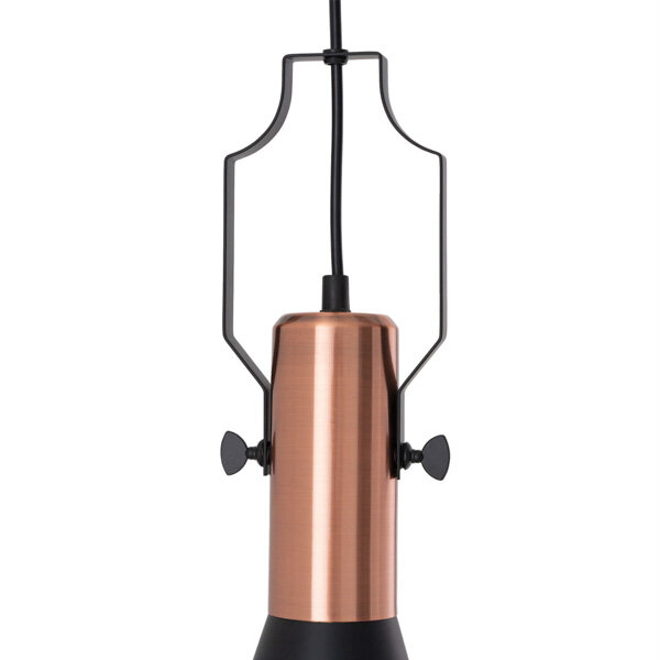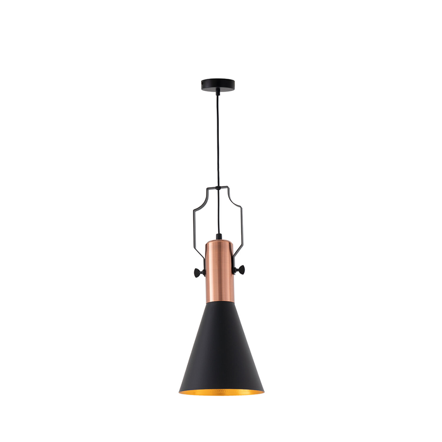 La lámpara de techo ASEVAR destaca por su diseño elegante con un marcado aire industrial. Fabricada en metal negro, su interior dorado añade una luz cálida y envolvente, ideal para crear ambientes acogedores. En el exterior, los detalles en cobre aportan un toque sofisticado y refinado que realza su estética. Perfecta para colgar sobre mesas de comedor, islas de cocina o en salones modernos, la ASEVAR combina funcionalidad e impacto visual con mucho estilo. Tipo bombilla: 220/240 E27. Potencia máxima: 40W (bombilla no suministrada).