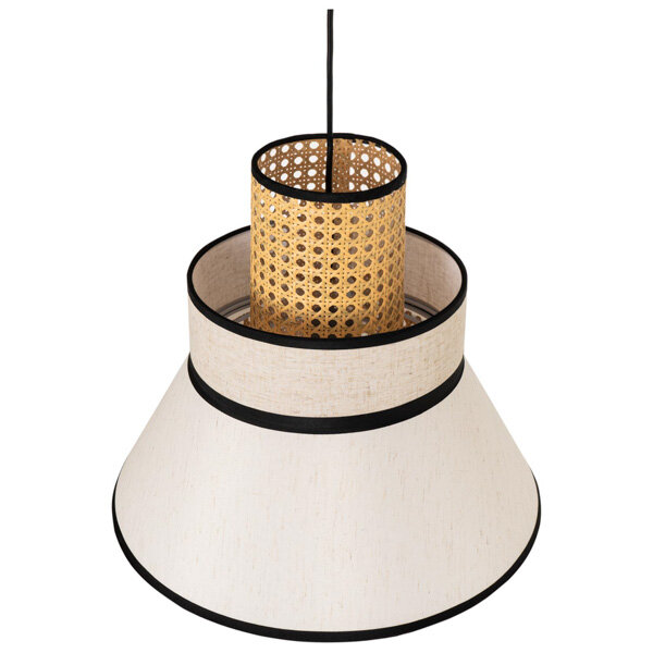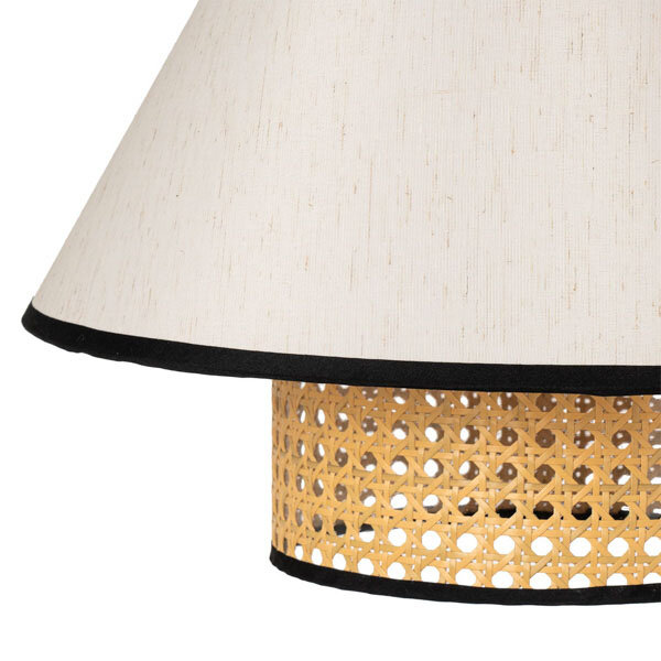 La lámpara de techo NERJA fusiona materiales naturales y diseño contemporáneo en una pieza llena de encanto. Su pantalla combina tela y ratán, permitiendo una iluminación cálida y suave que transforma cualquier espacio en un ambiente acogedor. Los bordes en tela negra enmarcan el diseño y aportan un sutil contraste que realza su forma, dándole un acabado más definido. Perfecta para comedores, salones o dormitorios de estilo boho, mediterráneo o nórdico, la NERJA es una opción decorativa que equilibra naturalidad y sofisticación. Tipo bombilla: 220/240 E27. Potencia máxima: 40W (bombilla no suministrada).