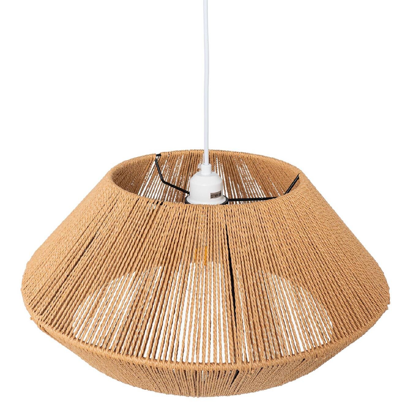 Detalles: Medida pantalla: ø50 x 22 cm | Medida pletina techo: ø10 x 2,50 cm | Medida cable: 110 cm | Peso producto: 1,70 kg | Advertencia tolerancia: +/- 1 cm | Nº paquetes: 1 | Artículos por paquetes: 1 | Dimensión paquete: 55 x 55 x 24 cm | Peso paquete: 2 kg | Manipulación: 1 persona | Estructura: METAL/CUERDA DE CÁÑAMO | Tipo bombilla: 220/240 E27 MAX:40W (NO INCLUIDA) | Código del producto: 00LP105507 | Las imágenes y/o colores de los productos pueden variar ligeramente por motivos de calibrado de pantalla, luz ambiente de la fotografía, ángulo de la misma, remesa producción madera, textil, etc. | Recomendaciones: | Uso y mantenimiento: