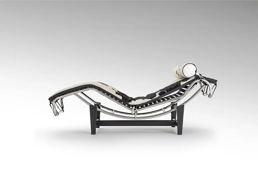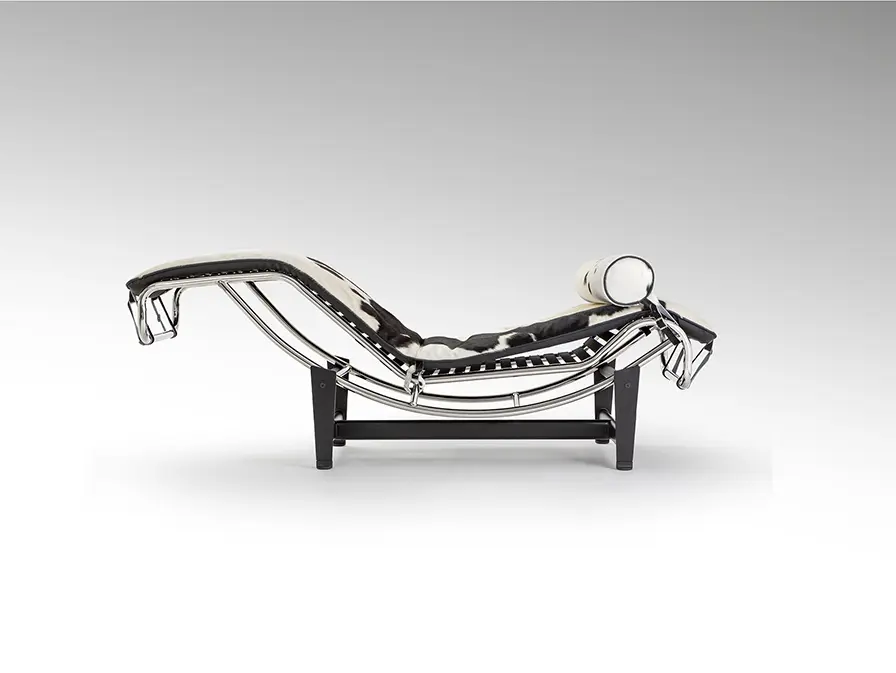 Chaise longue con estructura en acero acabado cromo y base de metal en acabado negro. Asiento basculante tapizado en su cara anterior en piel de vaca natural con pelo en manchas blanco y negro, y su cara posterior en polipiel.