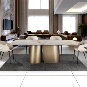 Mesa de comedor realizada en DM contrachapado en roble oscuro, acero inoxidable acabad oro rosa. Tapa de porcelánico de 5 mm, acabado mármol veteado, con cantos redondeados.