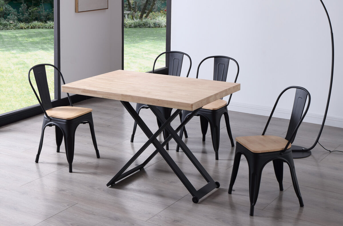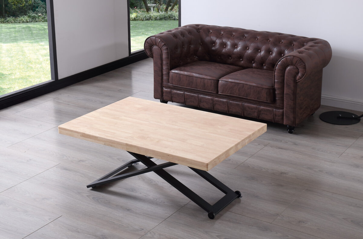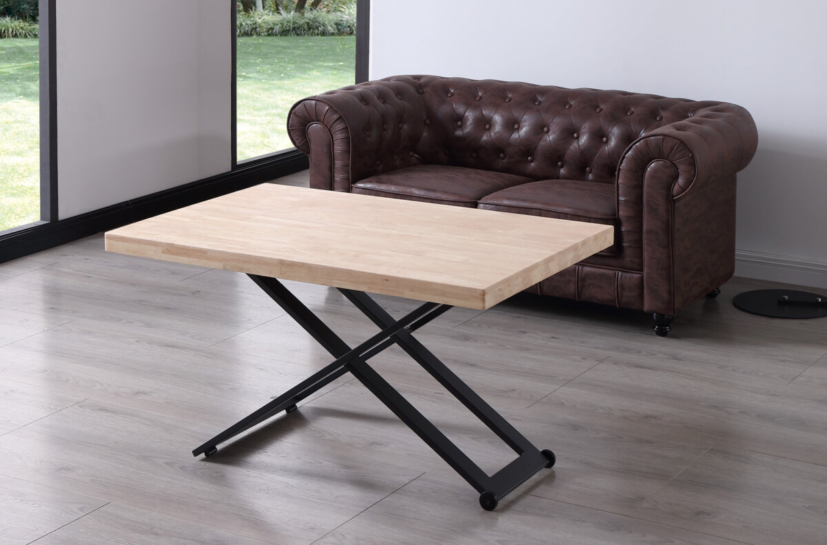 Mesa de centro elevable. | Tapa en madera de roble. | Estructura metálica color negro. | Altura regulable. | Medidas: 120 x 80 cm.