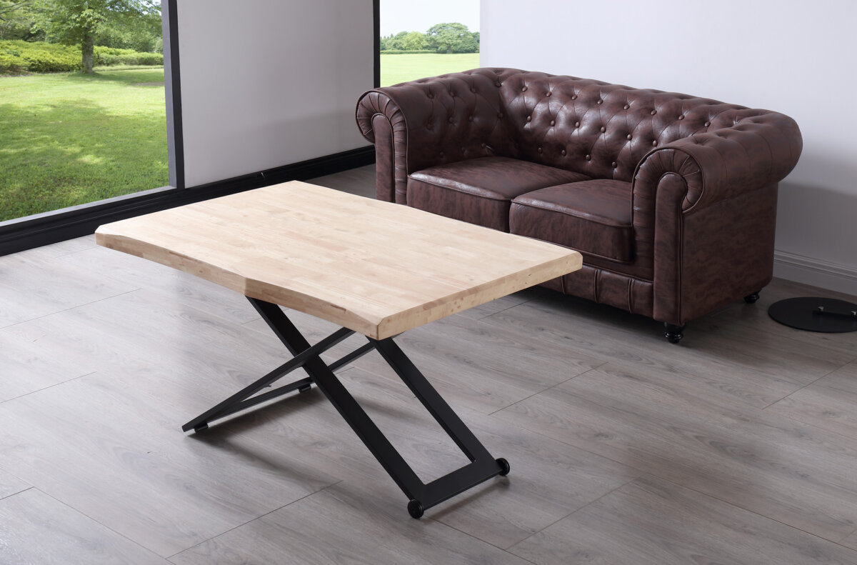 Mesa de centro elevable. | Tapa con forma en madera de roble. | Estructura metálica color negro. | Altura regulable. | Medidas: 120 x 80 cm.