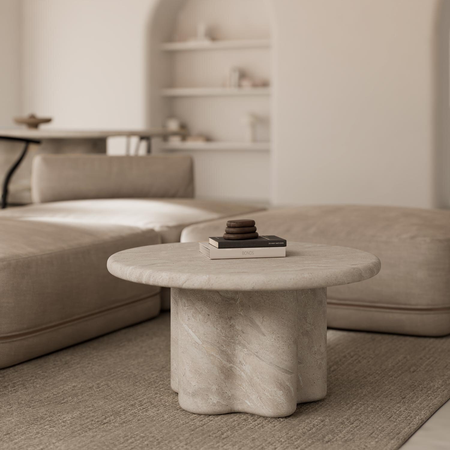 La mesa de centro LUIGI destaca por su diseño elegante y refinado, que combina la fuerza del cemento-GFRC (reforzado con fibra de vidrio) con la delicadeza visual del efecto mármol travertino. Esta combinación de materiales otorga a la pieza un carácter escultórico que captura la atención sin necesidad de excesos decorativos. Sus dimensiones y su diseño único, añaden tanto profundidad como realismo al conjunto, convirtiéndola en una pieza que invita tanto al tacto como a la contemplación. Ideal para espacios contemporáneos, minimalistas o de estilo wabi-sabi, la mesa LUIGI funciona como mesa de centro en salones amplios, zonas de espera con diseño cuidado o incluso en lobbies de hoteles que apuestan por una estética serena y natural. Además, gracias a su resistencia, puede usarse tanto en espacios interiores como exteriores . En la foto están la mesa de centro LUIGI y la mesa auxiliar EMERIC, se venden por separado. Pequeñas irregularidades en la pigmentación, como poros visibles, son