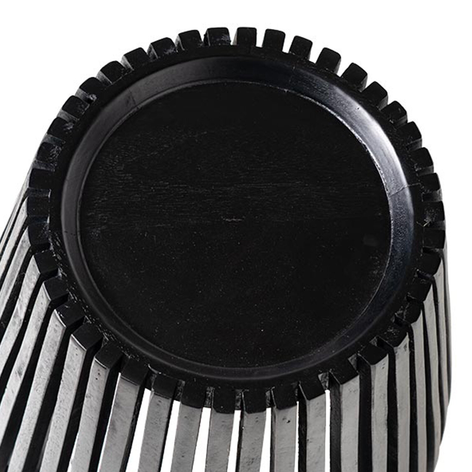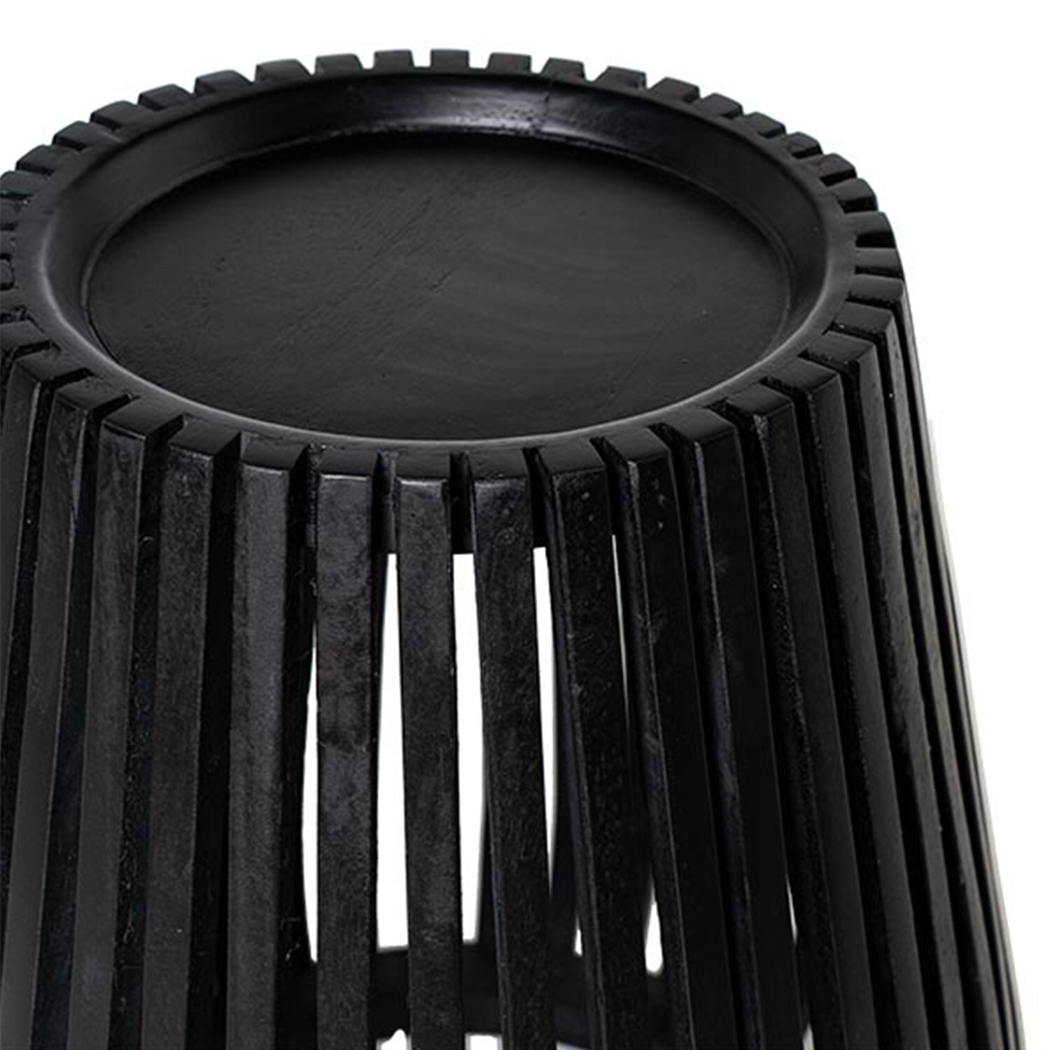 La mesa de centro MARATI destaca por su diseño envolvente y estructural, donde las finas barras de madera de mango crean un efecto visual único y contemporáneo. Dispuestas de forma vertical y con un espacio cuidadosamente medido entre cada una, estas lamas generan una sensación de ligereza y fluidez, permitiendo que la luz atraviese la pieza y proyecte sombras dinámicas sobre el suelo. El acabado negro intensifica el impacto visual, aportando un aire sofisticado y moderno. En contraste, la superficie superior cerrada crea un área funcional que mantiene la estética minimalista sin perder su esencia práctica. En la foto están la mesa MARATI 50 y la mesa MARATI 80, se venden por separado.