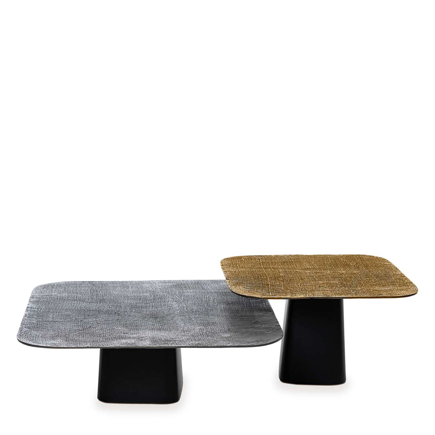 La mesa de centro SHAREM está fabricada en aluminio de alta calidad, con un elegante acabado en color negro que destaca por su modernidad y versatilidad. Su estructura se completa con una pata de metal que aporta estabilidad y refuerza su carácter contemporáneo. Se trata de una mesa de diseño artesanal, que puede presentar imperfecciones en su acabado final, aportando autenticidad y carácter. Con un diseño único e innovador, esta mesa es perfecta para complementar espacios de estilo minimalista, donde cada elemento juega un papel clave en la estética general. Su forma redondeada añade un toque distintivo y original, que no solo llama la atención, sino que también suaviza visualmente los ambientes en los que se integra. En la imagen están la mesa SHAREM y la mesa SANJAY, se venden por separado.