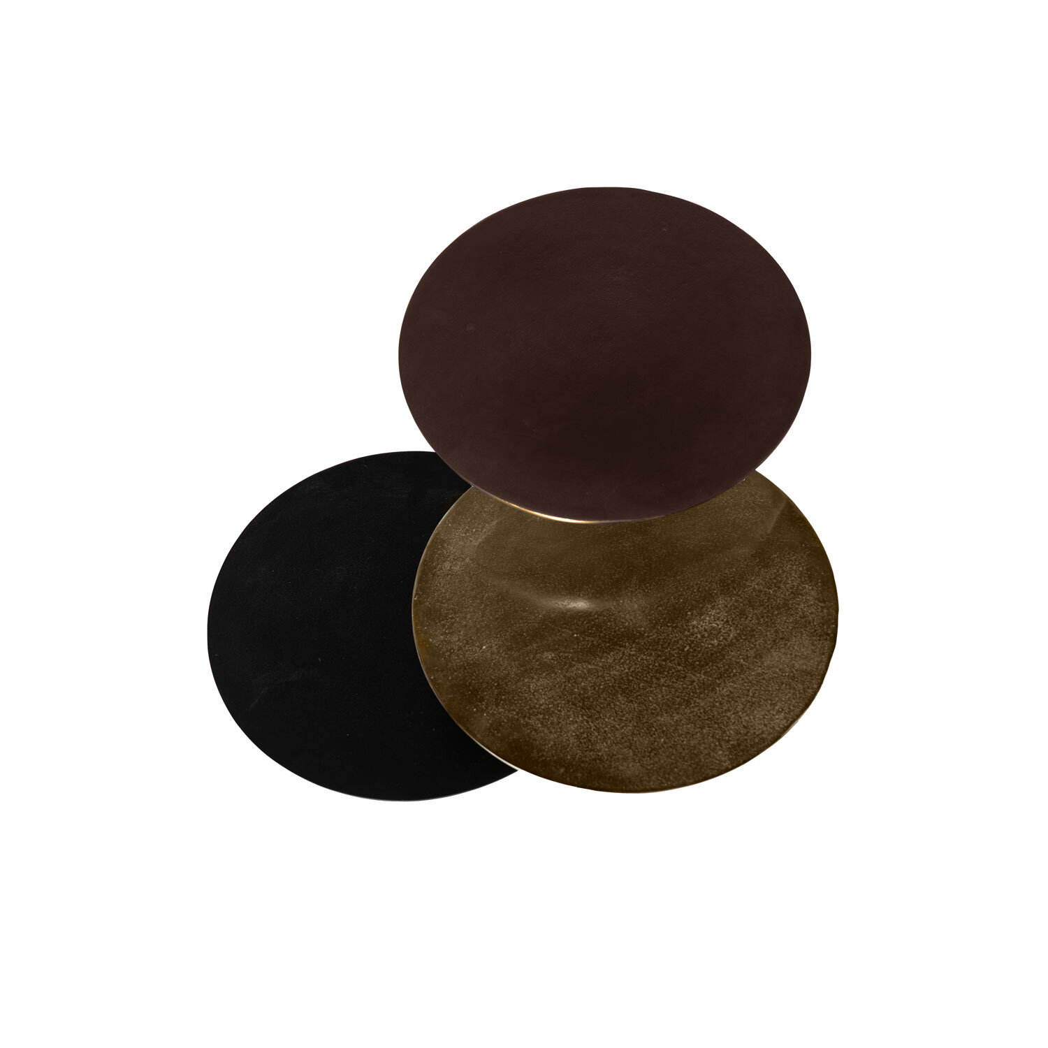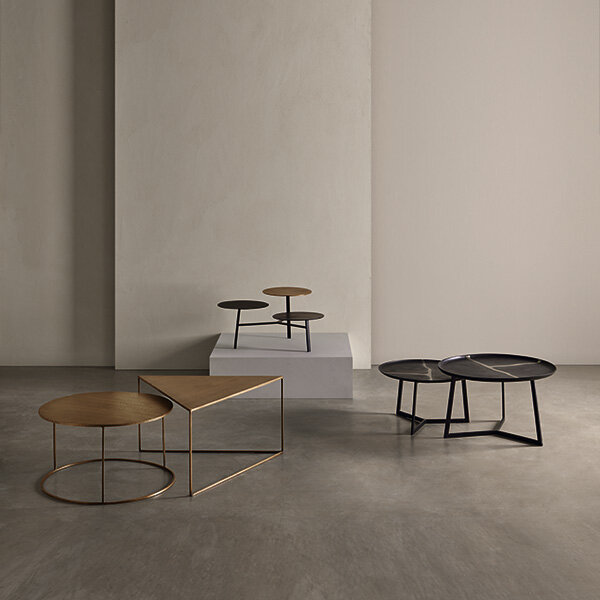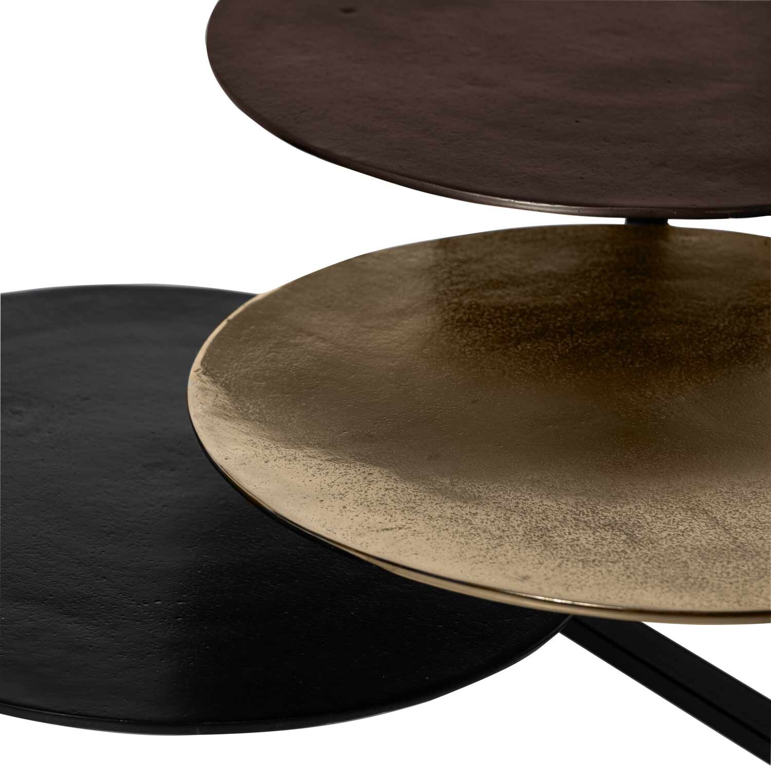 El set de mesas de centro VASANT está compuesto por tres mesas de aluminio en tonos dorado, bronce y negro, jugando con colores y acabados para crear un contraste sofisticado que aporta carácter y estilo a cualquier espacio. Las tapas, diseñadas como platos móviles, permiten reorganizarlas fácilmente para adaptarlas a cada situación, aportando versatilidad y un toque decorativo singular. Cada superficie presenta sutiles imperfecciones derivadas del proceso artesanal, realzando su autenticidad y convirtiendo a cada mesa en una pieza única e irrepetible. VASANT es ideal para salones contemporáneos o eclécticos donde el arte decorativo y la funcionalidad se encuentran.