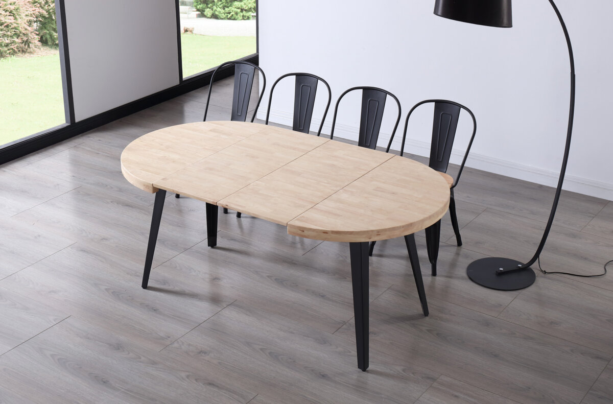 Tapa extensible en madera de roble. | Grueso exterior tapa 54 mm. | Patas metálicas color negro. | Extensible a 140 o 180 cm. | Medidas: 100 – 140 – 180 x 100 x 76 cm.