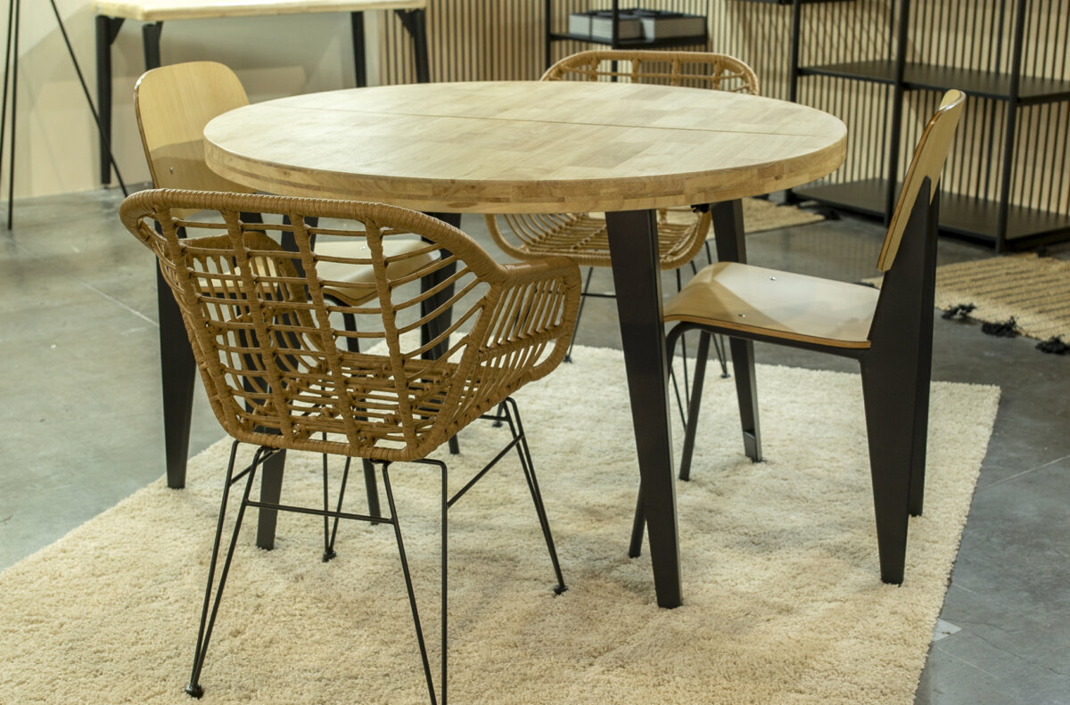 Tapa extensible en madera de roble. | Patas metálicas color negro. | Extensible a 160 o 200 cm. | Topes de suelo niveladores. | Medidas: 120 – 160 – 200 x 120 x 76 cm.