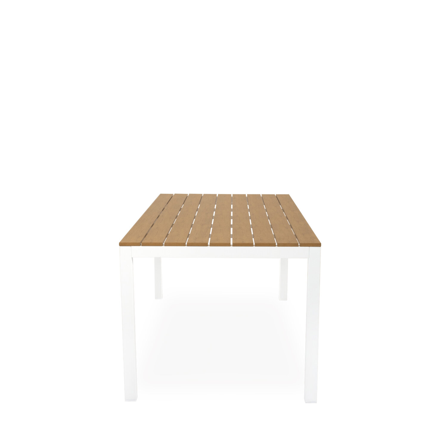 La mesa de exterior CINTHIA es un mobiliario versátil y funcional que se convierte en el centro de reuniones al aire libre, combinando estética y confort en cada encuentro. Su tapa está compuesta por tablones de polimadera en acabado natural, que evocan la calidez de la madera pero con la ventaja de ser un material prácticamente libre de mantenimiento, resistente a la intemperie y fácil de limpiar. La estructura de aluminio añade ligereza y durabilidad, convirtiéndola en una opción ideal para exteriores. Disponible en dos versiones, con patas en negro o blanco, CINTHIA se adapta a diversos ambientes, desde terrazas modernas hasta patios de estilo rústico.