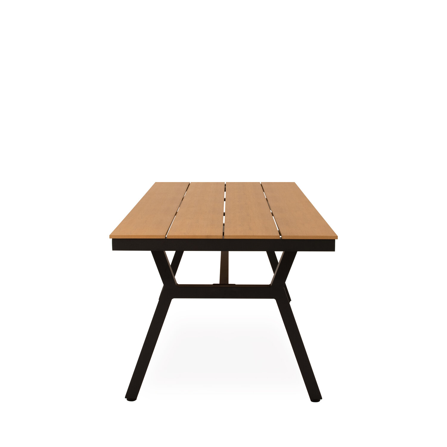 Si buscas una mesa espaciosa para reuniones al aire libre, la mesa GEORGIA es la opción perfecta. Con sus imponentes 200 cm de largo, ofrece un amplio espacio para recibir a varios comensales sin comprometer el estilo ni la comodidad. La tapa de polimadera en acabado natural recrea el aspecto cálido de la madera, manteniendo una alta resistencia a las condiciones exteriores. Su estructura de aluminio, disponible en elegante negro o en un suave beige, aporta ligereza y robustez, asegurando estabilidad y durabilidad en cada encuentro. Las patas en forma de “A” no solo añaden carácter al diseño, sino que también optimizan el soporte estructural, convirtiendo a GEORGIA en la pieza ideal para terrazas amplias, jardines o espacios exteriores donde la comodidad y el diseño son protagonistas.