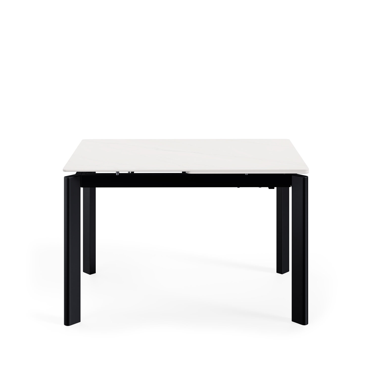 La mesa CONSTANCE 120 en su versión blanco y negro es una declaración de estilo puro y contemporáneo. Su sobre de porcelánico de 1,2 cm se presenta en un impoluto blanco mate que aporta luminosidad, equilibrio y una sensación de amplitud a cualquier estancia. Este acabado limpio y sofisticado hace que cada comida o encuentro adquiera un aire elegante y actual. Las patas de hierro en negro intenso ofrecen una base sólida y contrastan con el blanco de la superficie, creando una estética monocromática que funciona a la perfección en interiores modernos, nórdicos o minimalistas. La combinación de estos dos tonos atemporales convierte a esta mesa en una pieza fácil de integrar, ya sea en cocinas de líneas depuradas, comedores urbanos o espacios de coworking con alma creativa. Gracias a su sistema extensible lateral giratorio , CONSTANCE pasa de 120 a 180 cm, adaptándose sin esfuerzo a las exigencias del día a día o de una cena improvisada.