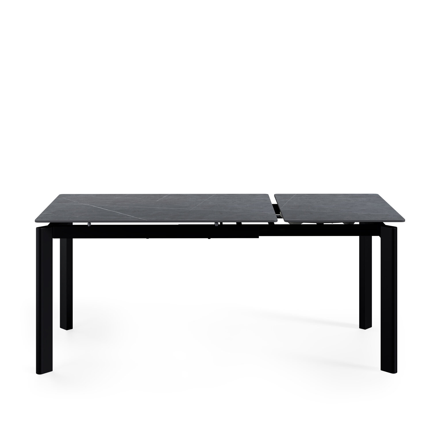 La mesa CONSTANCE 140 en acabado gris y negro combina sobriedad y modernidad en una pieza versátil que se adapta con elegancia a distintos estilos decorativos. Su tapa de porcelánico gris de 1,2 cm de grosor, con un sutil veteado que recuerda a la piedra natural, aporta textura visual y un aire sereno, ideal para espacios contemporáneos que apuestan por la calma y el equilibrio. Las patas de hierro en color negro refuerzan su estructura con firmeza, al tiempo que añaden un contraste sofisticado que estiliza su silueta. Esta armonía cromática entre el gris neutro del sobre y la base oscura convierte a CONSTANCE en una mesa con carácter discreto pero innegable presencia. Diseñada para ser funcional sin renunciar al diseño, su sistema extensible lateral giratorio permite ampliar su superficie de 140 a 200 cm, adaptándose a diferentes momentos del día o a visitas inesperadas. Su perfil delgado y líneas rectas la hacen especialmente atractiva para comedores modernos, zonas de oficina o coci