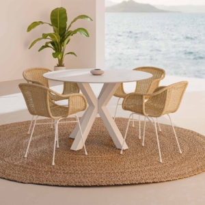Detalles: CARACTERÍSTICAS: Detalles Tapa: PORCELÁNICO Detalles Pata: METAL Requiere montaje: SÍ Extensible: NO Código del producto: 00MS217669 Las imágenes y/o colores de los productos pueden variar ligeramente por motivos de calibrado de pantalla, luz ambiente de la fotografía, ángulo de la misma, remesa producción madera, textil, etc. | DIMENSIONES ARTÍCULO: Ancho: ø100 cm Altura máxima: 76 cm Fondo: ø100 cm Grosor tapa: 1,2 cm Medida entre patas (frontal): 51 cm Medida entre patas (lateral): 80 cm Advertencia tolerancia: +/- 2 cm | PAQUETES: Nº paquetes: 2 Artículos por paquetes: 1 Dimensión paquete 1: 108 x 105 x 7 cm Peso paquete 1: 25 kg Dimensión paquete 2: 77 x 47 x 18 cm Peso paquete 2: 21 kg Tapón en patas: SÍ Manipulación: 2 personas | MANTENIMIENTO: Recomendaciones: No colocar cerca de fuentes de calor o luz solar. Es recomendable quitar el polvo de los tapizados. Los elementos afilados o metálicos pueden rayar la superficie o producir desgarros. Uso y mantenimiento: Limpiar con paño ligeramente humedecido en agua y jabón neutro con movimientos en círculo. Frotar suavemente. Secar con paño seco. No utilizar productos abrasivos o químicos (lejías, acetonas, disolventes, etc.). Se puede utilizar ligeramente agua y jabón neutro para superficie
