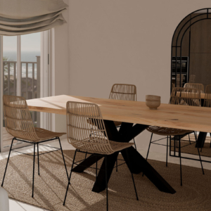 La mesa GRACE destaca por su diseño robusto y elegante. Su tapa, de 5 cm de grosor, está hecha de madera de roble maciza con un acabado natural que resalta la belleza y la forma única de la madera. Las patas de metal blanco, dispuestas en un patrón asimétrico añaden un toque estético y distintivo. La combinación de la tapa de roble con las patas de metal confiere a la mesa GRACE un carácter único y llamativo. Es ideal para ambientes con decoraciones de estilo industrial, donde se convertirá en el centro de atención.
