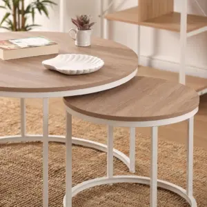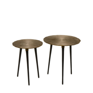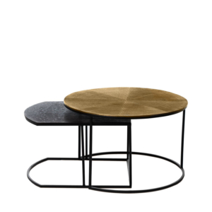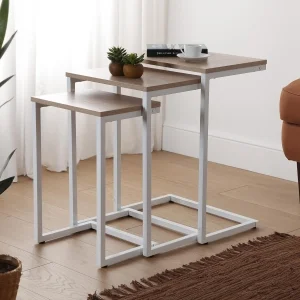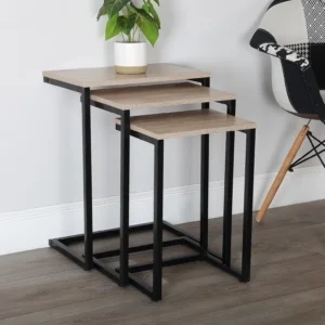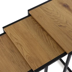 Pareja de mesas auxiliares realizadas en metal, acabado negro mate. Tapa de DM con superficie melamínica de alta resistencia, acabado madera.