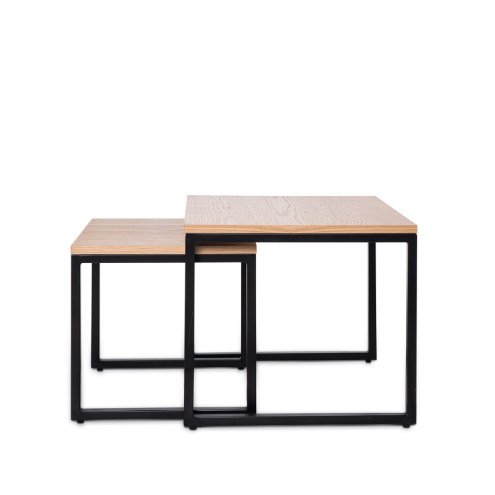 que equilibra la calidez de la chapa de roble, la elegancia del negro y la sobriedad del gris. Sus patas de metal en acabado negro refuerzan su estilo moderno, creando una armonía cromática que enriquece cualquier espacio. Este conjunto está compuesto por tres mesas de distintos tamaños, lo que permite múltiples disposiciones según las necesidades del ambiente, aportando funcionalidad y dinamismo al diseño. Su estética contemporánea, con un sutil aire industrial chic, lo convierte en una opción ideal para interiores modernos y vanguardistas. No se venden por separado.