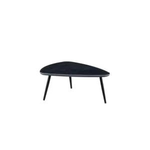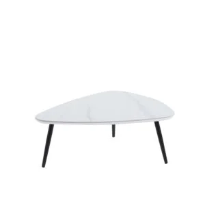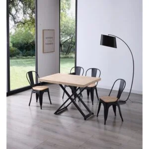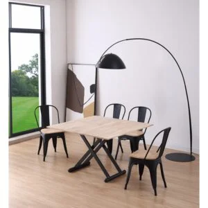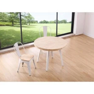 Tapa con formas en madera de roble. Patas metálicas color blanco. Medidas: 150 x 90 x 76 cm.