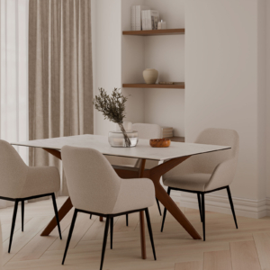 La mesa fija DELLA es una expresión de equilibrio entre elegancia y naturalidad. Sus patas de madera de hevea acabada en roble, con su tono cálido y veteado natural, transmite solidez y autenticidad, mientras que el cristal templado de su superficie aporta una sensación de ligereza y sofisticación. Gracias a su diseño depurado y líneas rectas, encaja perfectamente en interiores contemporáneos, industriales o incluso nórdicos, aportando luminosidad y amplitud al espacio.